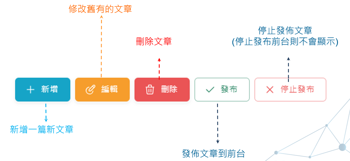 列表按鈕 新增 : 新增一篇新文章,跳轉到新增頁面 修改 : 修改勾選文章 複製 : 複製勾選文章 刪除 : 刪除選擇文章(可多筆刪除) 發布:將文章顯示於前台(可多筆發布) 停止發布:前台網站隱藏文章(可多筆停止發布) 在編輯頁面時的按鈕