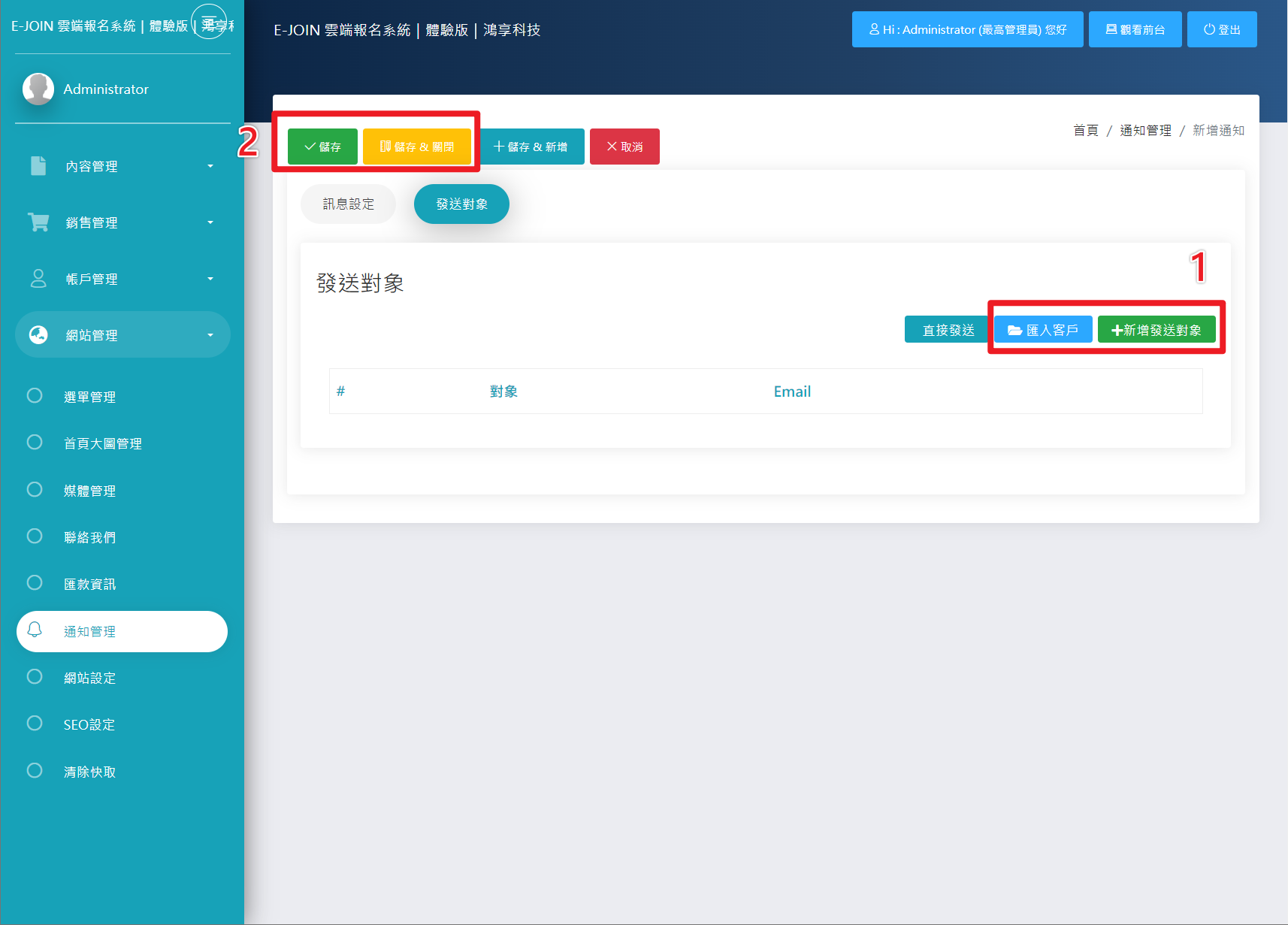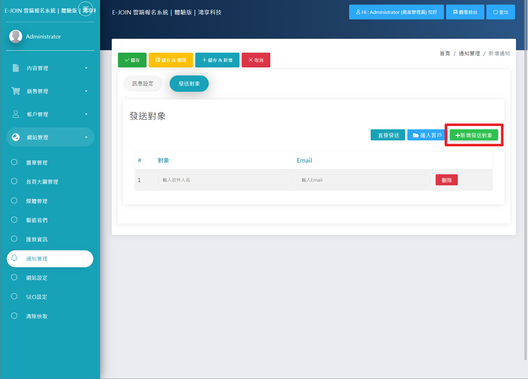 - 新增發送對象:直接輸入EMAIL、名稱(可輸入非會員的郵件)