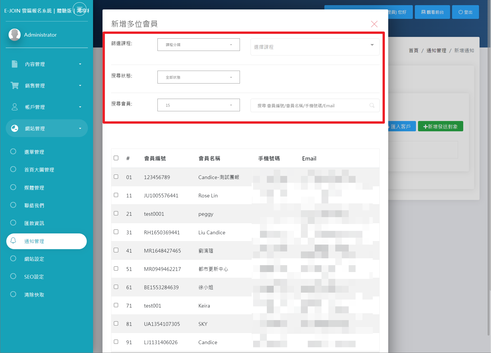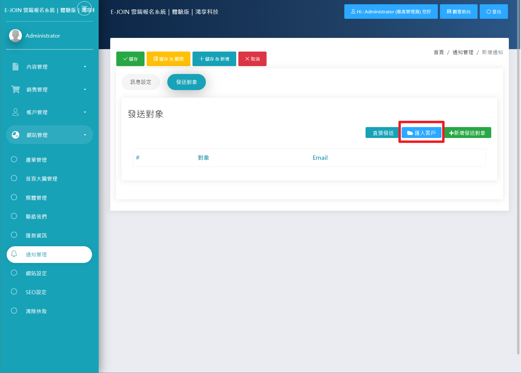 - 匯入客戶:選擇後台既有的會員做批次篩選及匯入